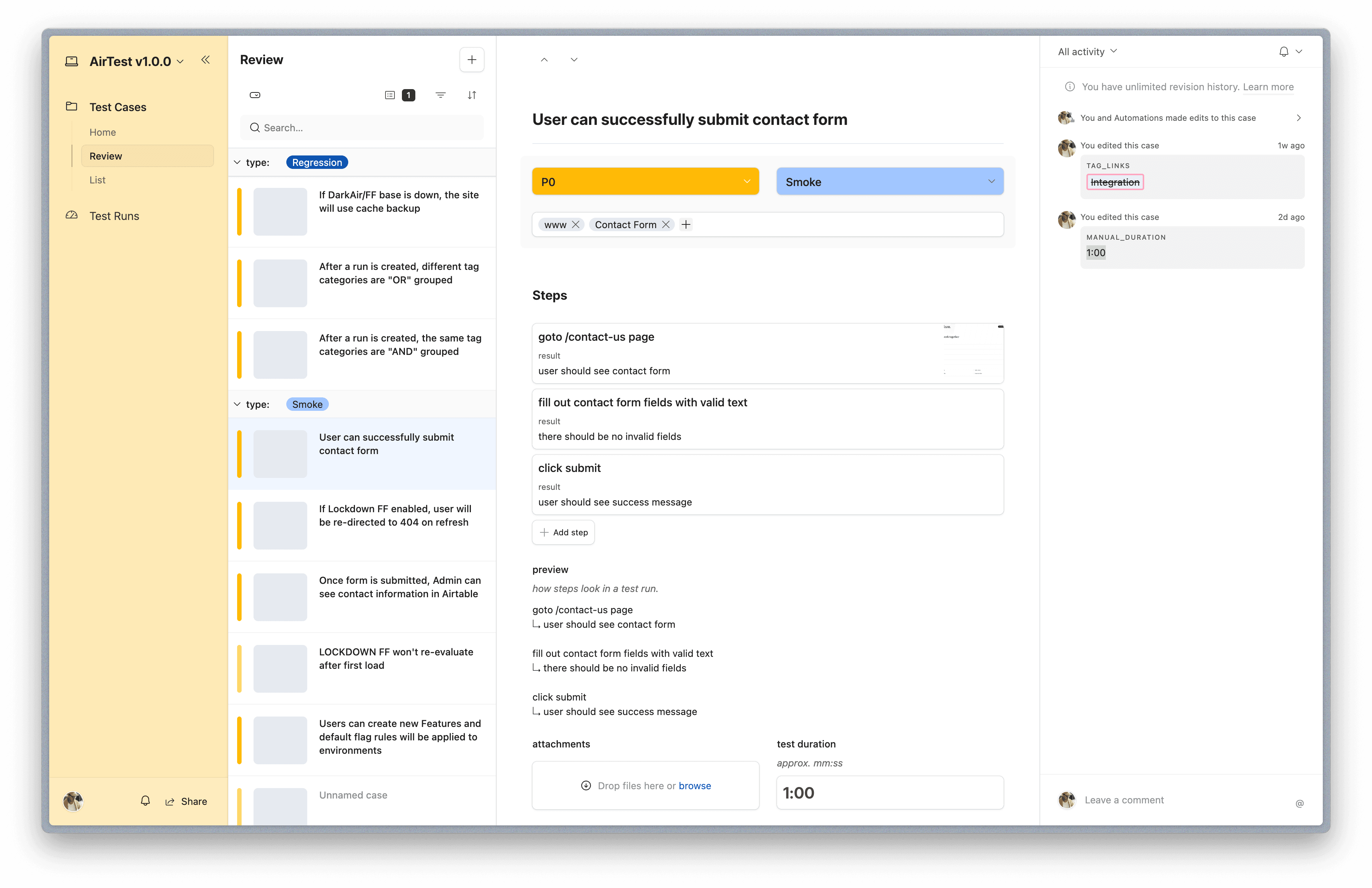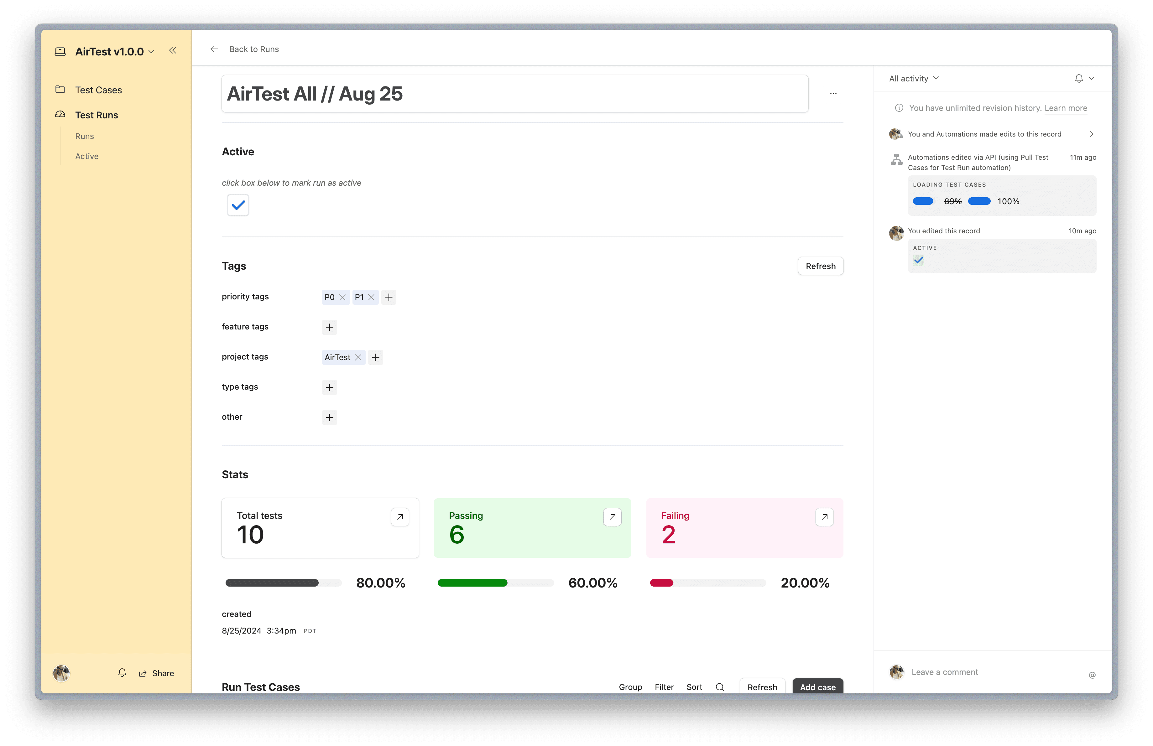 Manage test cases and test runs using the power of the connected apps platform, Airtable.